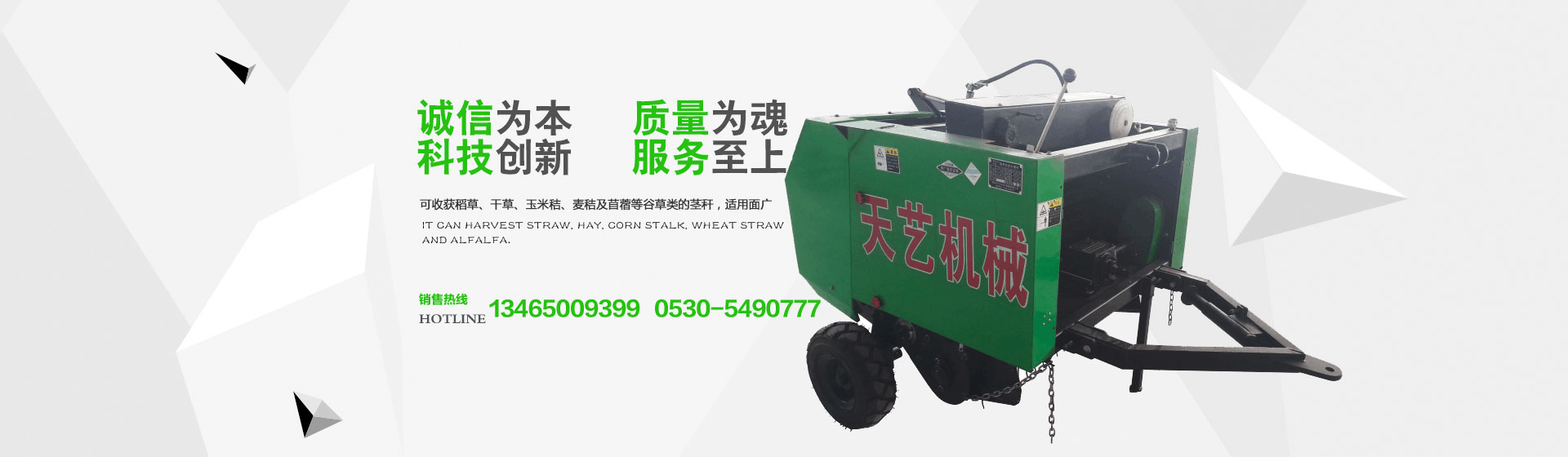 菏澤市天藝農(nóng)業(yè)機(jī)械制造有限公司是一家歷史悠久、實(shí)力雄厚的現(xiàn)代化農(nóng)業(yè)機(jī)械企業(yè)。公司始建于1993年,其前身是菏澤市農(nóng)用水泵廠(chǎng)。經(jīng)過(guò)20多年的不斷發(fā)展,菏澤市天藝農(nóng)業(yè)機(jī)械制造有限公司不斷成長(zhǎng)為一家集加工、科研、機(jī)械制造為一體的專(zhuān)業(yè)化生產(chǎn)企業(yè)。公司主要產(chǎn)品有大、中、小型系列玉米剝皮機(jī)、系列秸稈撿拾打捆機(jī)、根莖作物收獲機(jī)、四驅(qū)自走高桿作物噴桿噴霧機(jī)等。我公司于2008年與菏澤學(xué)院合作成功研制出TYSL-70100型秸稈撿拾打捆機(jī),并于2010年獲得國(guó)家專(zhuān)利補(bǔ)貼投放市場(chǎng)。進(jìn)入市場(chǎng)后,我公司秉承:誠(chéng)信為本,質(zhì)量為魂,科技創(chuàng)新,服務(wù)至上的宗旨;不斷改進(jìn)創(chuàng)新,提升產(chǎn)品質(zhì)量。同時(shí)為滿(mǎn)足不同客戶(hù)的需求,先后推出了獲有國(guó)家專(zhuān)利補(bǔ)貼的:9Y-70125、9Y-80125、9YJ-130、9YJ-180、9YJ-2250、9YQ-2300等系列圓捆打捆機(jī);9YFS-2200、9YFQ-2200方草捆打捆機(jī);9YFS-2.2雙軸秸稈粉碎打捆機(jī)、9YFP-2.2粉碎除塵方捆打捆機(jī) 。該系列撿拾打捆機(jī)適合小麥、水稻、玉米站桿、倒伏桿、碎桿、棉柴、牧草、谷草、蘆葦?shù)鹊膿焓啊⒎鬯槭斋@。各規(guī)格產(chǎn)品技術(shù)產(chǎn)數(shù)詳見(jiàn)其對(duì)應(yīng)技術(shù)規(guī)格表...